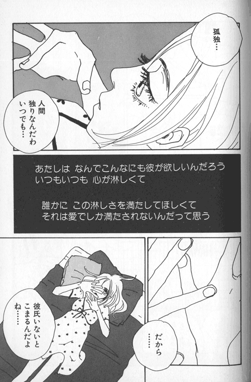 解説するまでも無いだろう。バックはただの網目のスクリーントーン。効果音、擬音、集中線等一切無し。 だが、キャラの心情や現実がひしひしと伝わってくる。(ハッピーマニア10巻71Pも是非見て欲しい、鳥肌が立つページだ) 彼女の漫画を読むときは是非、このアングル取りにも注目して欲しいところだ。 ◆今回のマンガ ・ジェリービーンズ ※怒りの四つ角 |