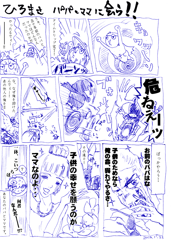 長男が誕生した3日目、病院で描きました。下書きなし、フリーハンドで勢いに任せて1時間くらいで・・・。院長先生が1コマめを「産道を象徴している!」と言ったとか。いや、そんなつもりはまったく無いんですけど。むしろ何も考えていないです。